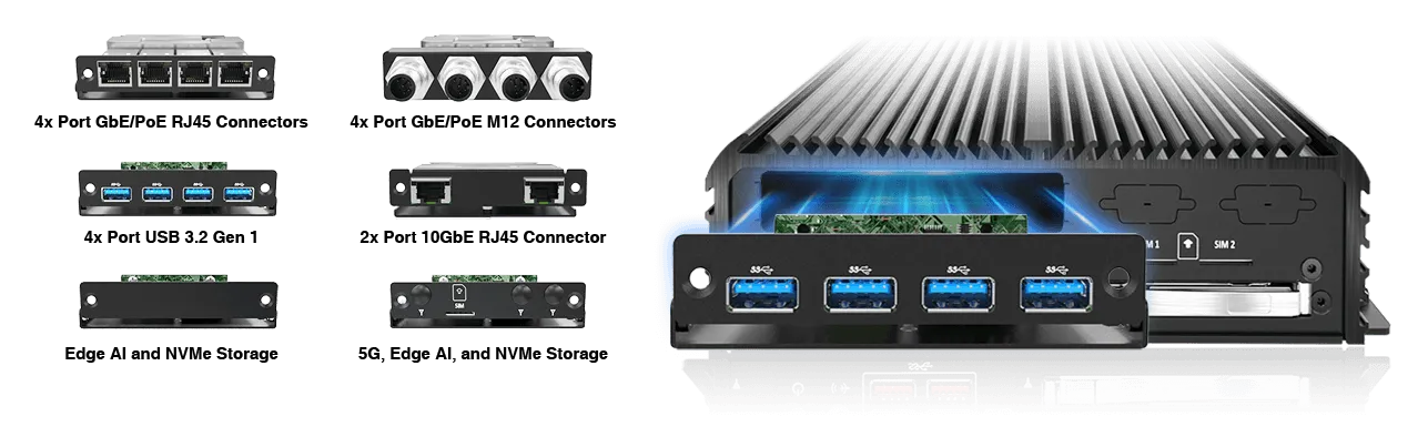 - 2x M.2 B-Key 2242/3042/3052 for NVMe/AI Module and 4G/5G Module